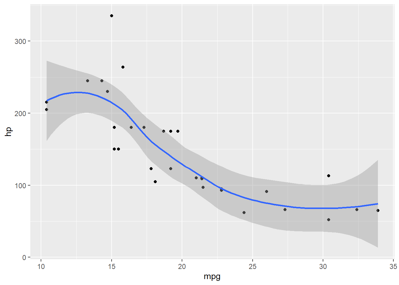 ggplot(mtcars, aes(x = mpg, y = hp))+ geom_point()+ geom_smooth()`geom_smooth()` using method = 'loess' and formula = 'y ~ x'