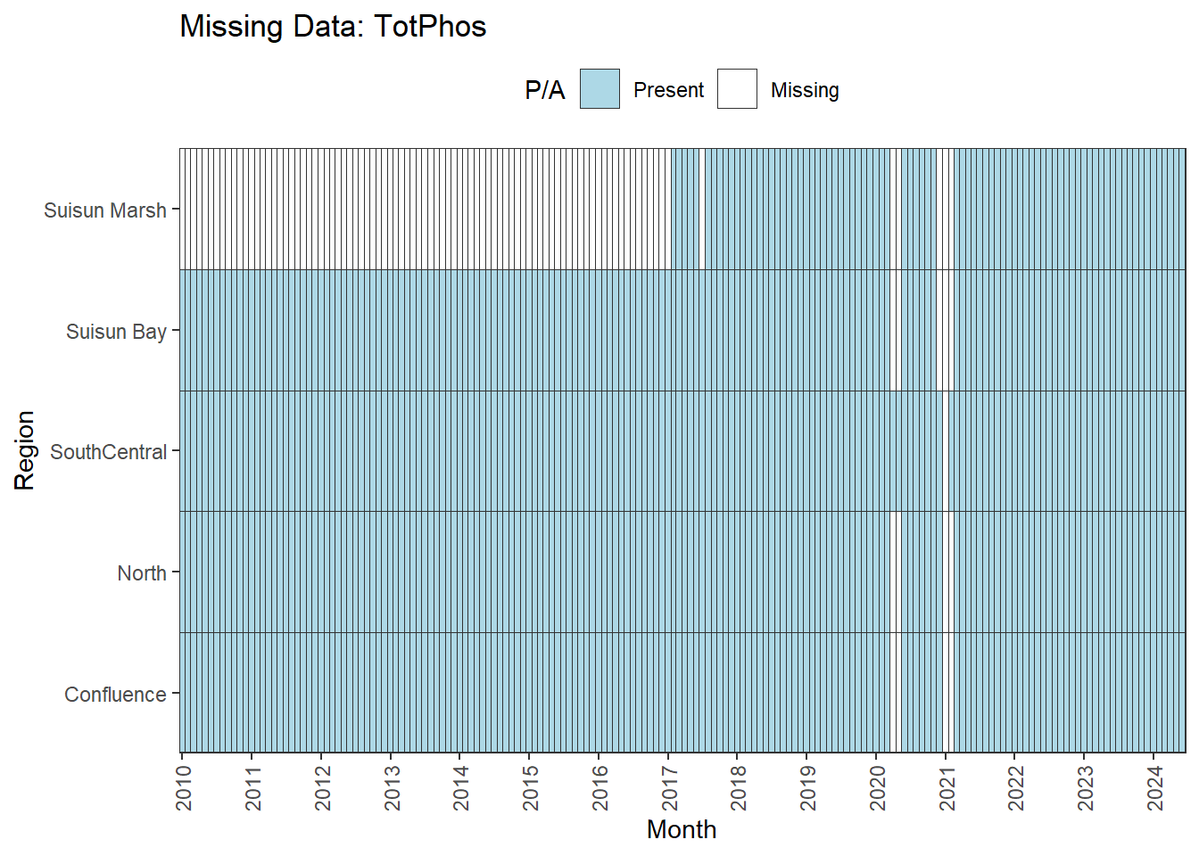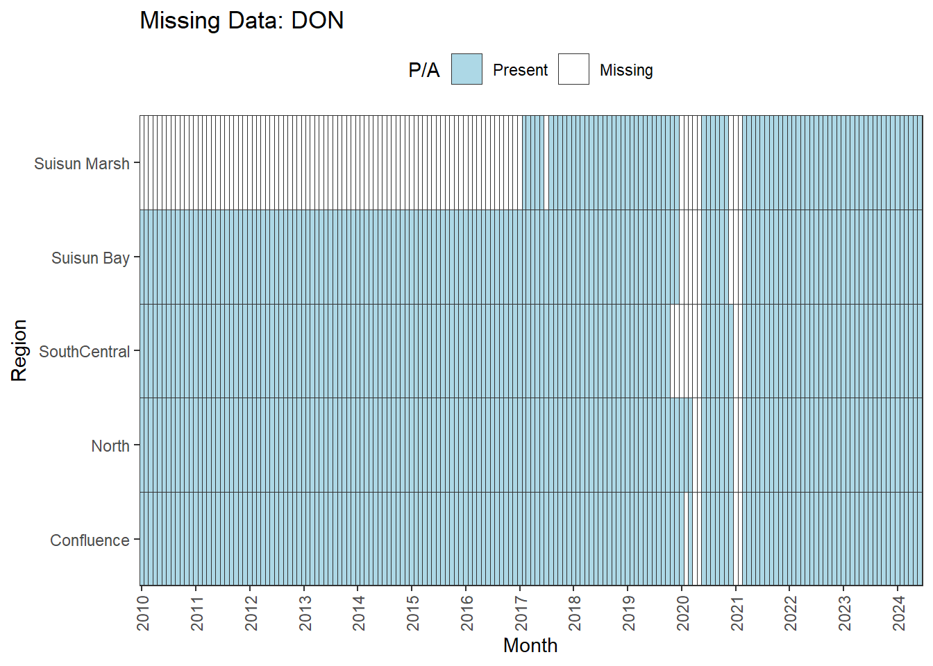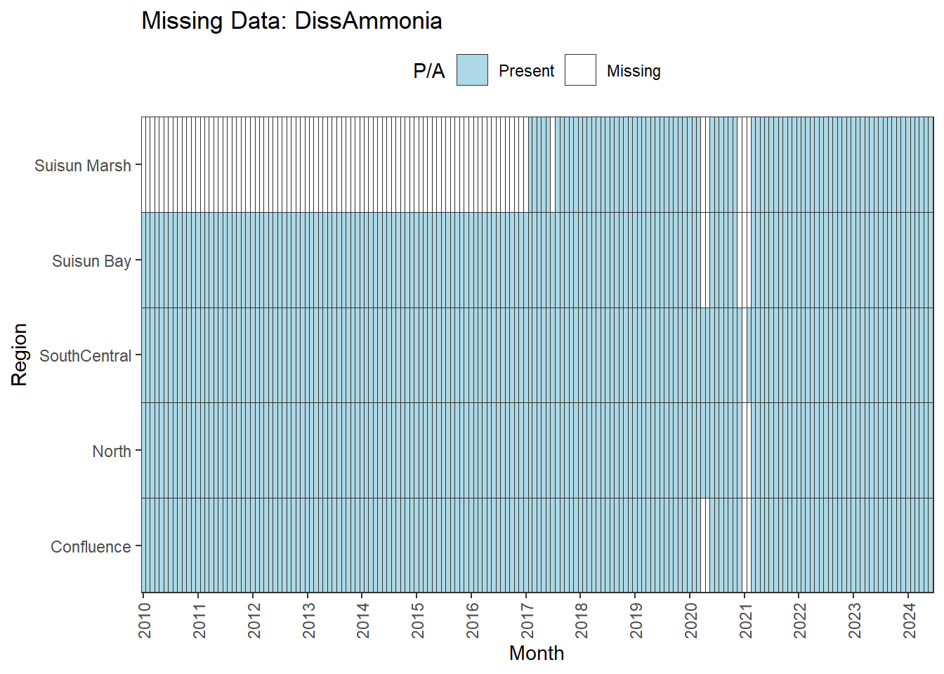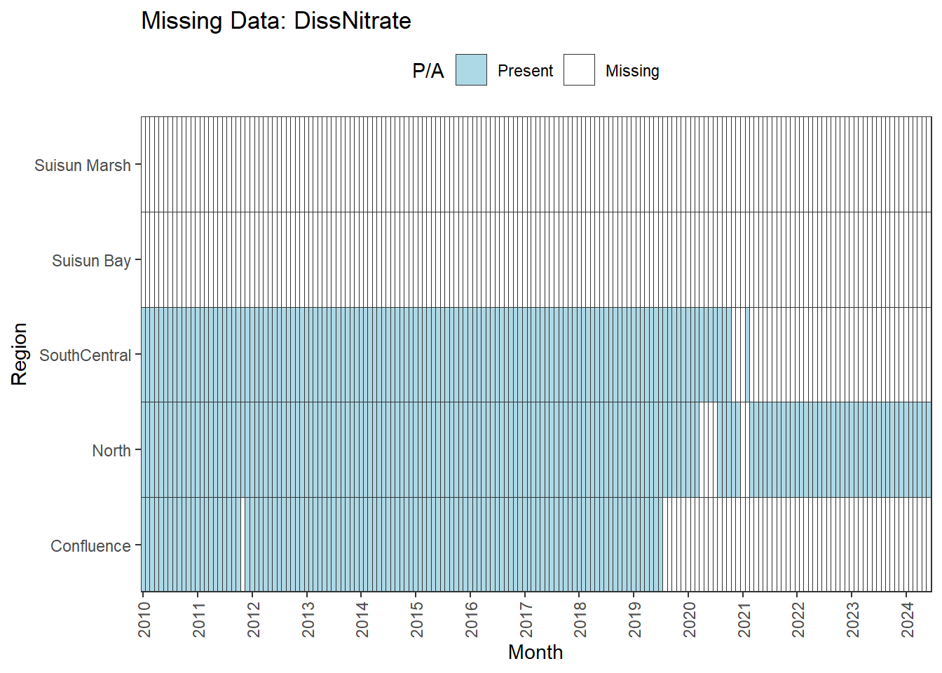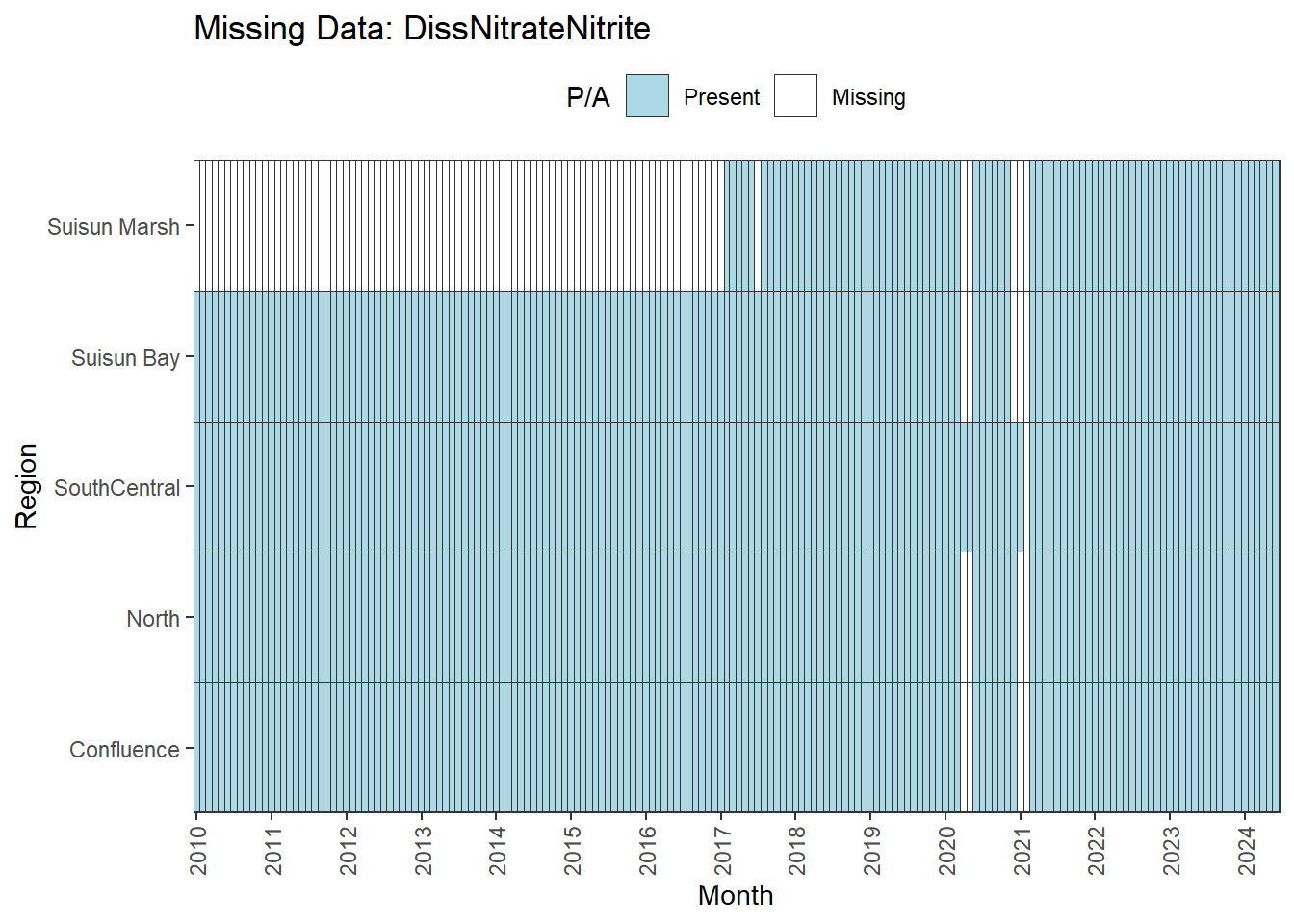 **missing data (Suisun Marsh):** DissAmmonia, DissNitrateNitrite, DissOrthophos, DON, TKN, TotPhos