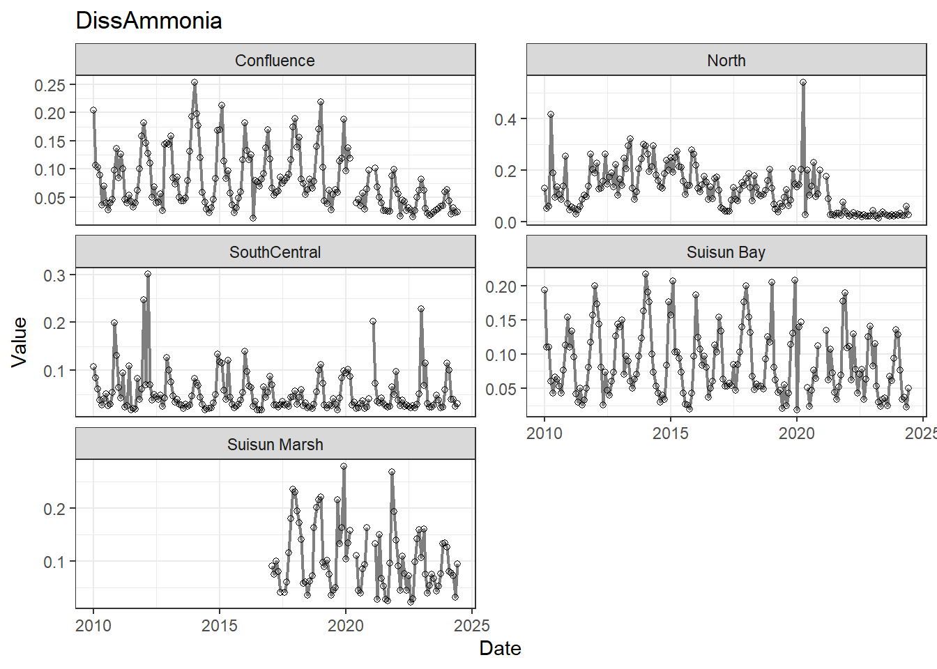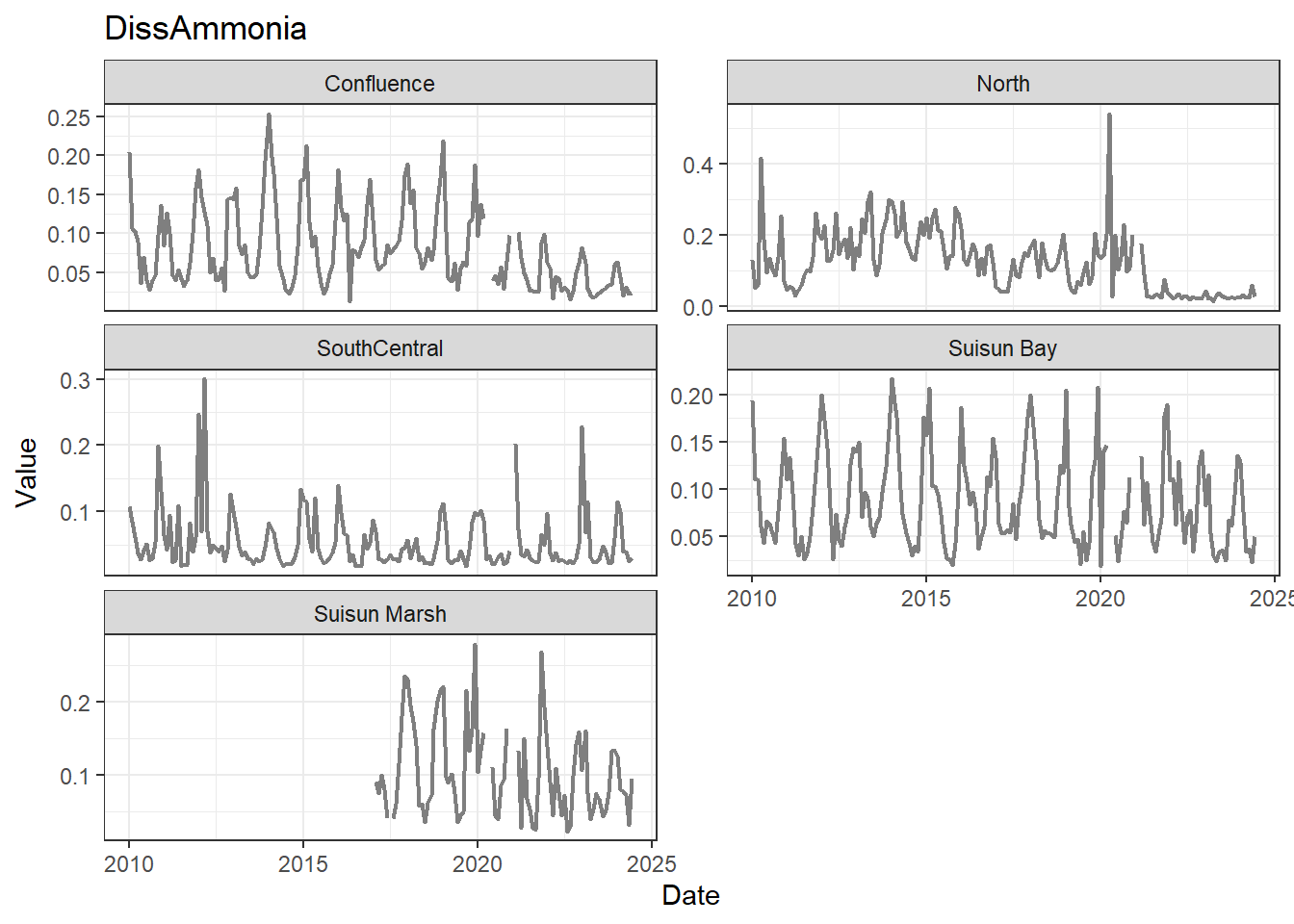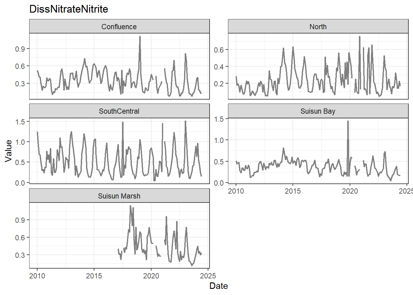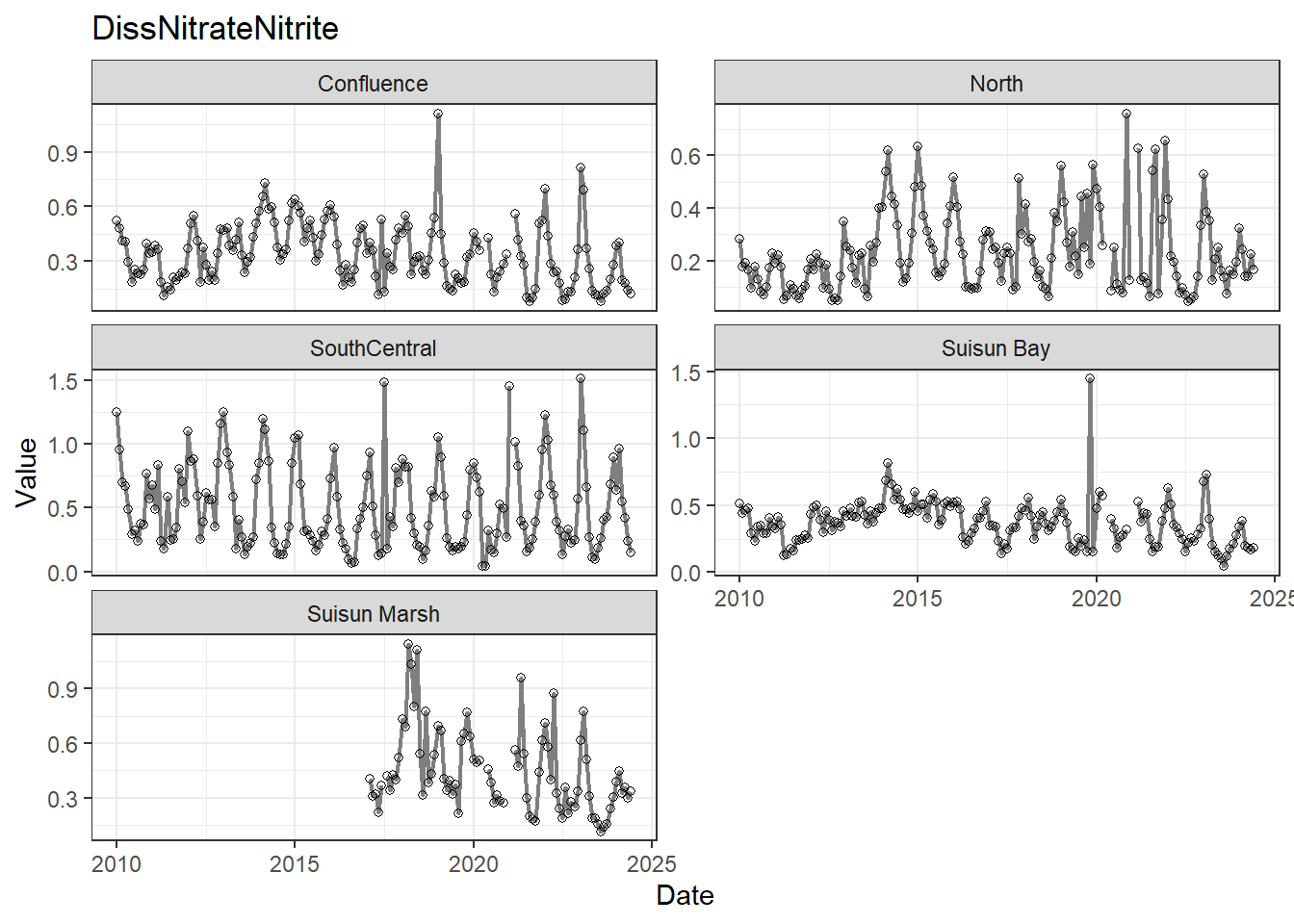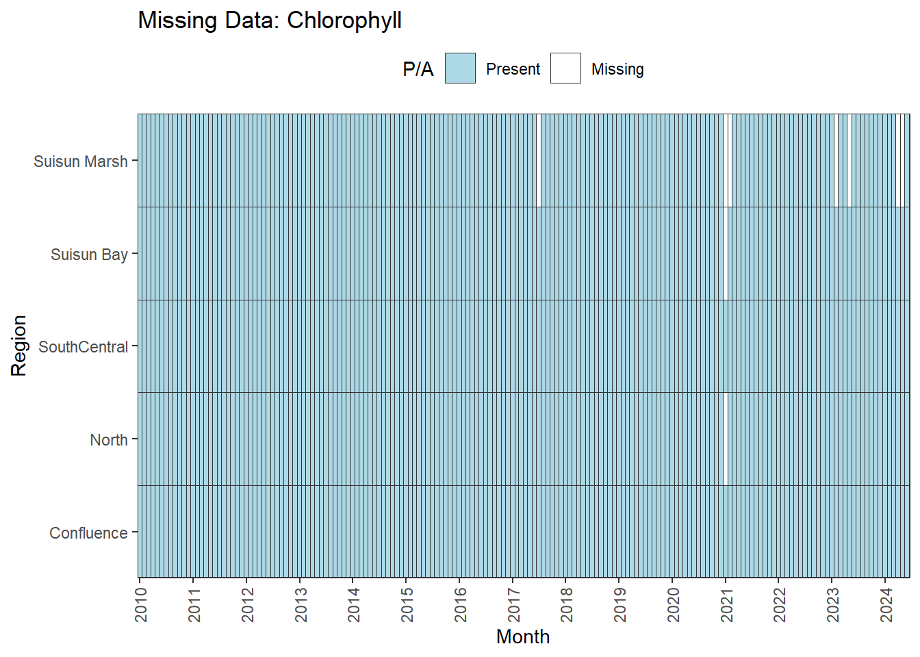 **missing data (Suisun Marsh):** DissAmmonia, DissNitrateNitrite, DissOrthophos, DON, TKN, TotPhos