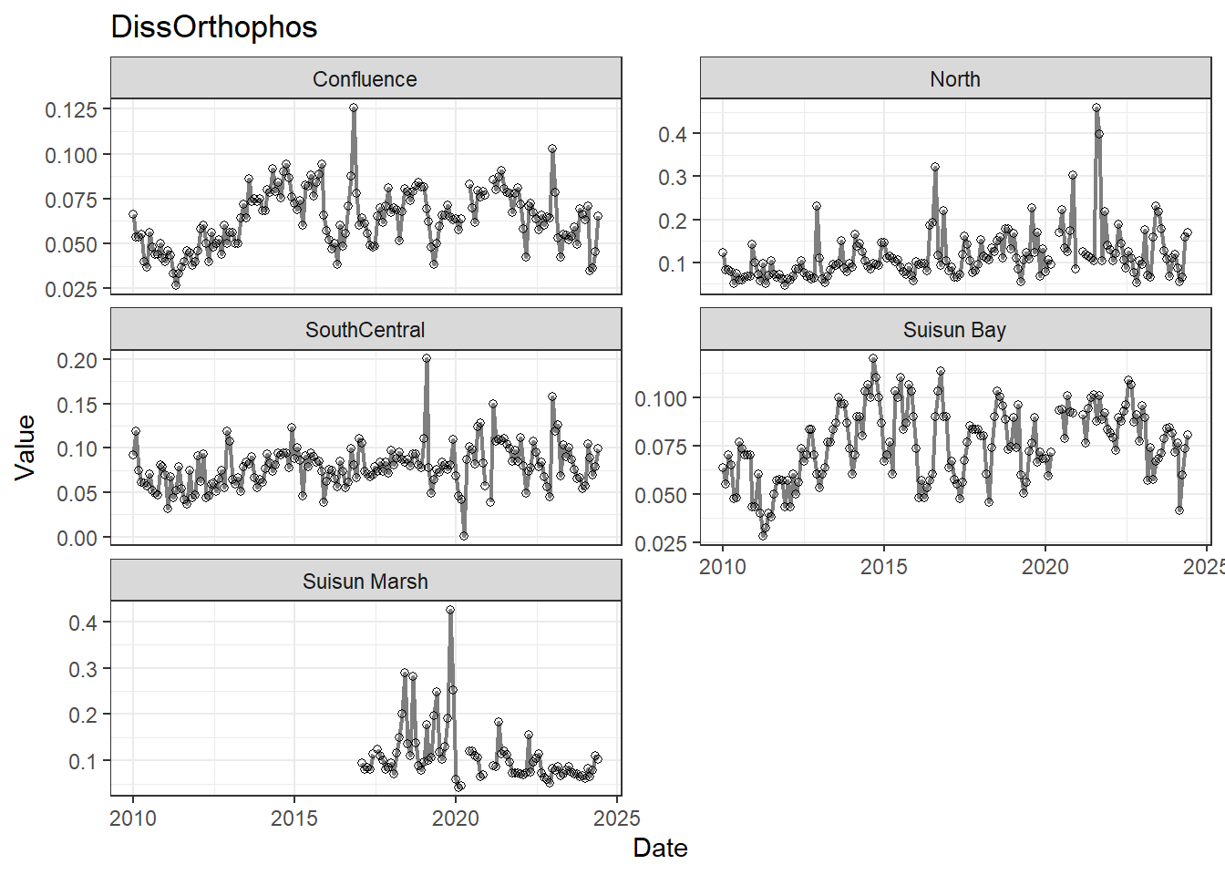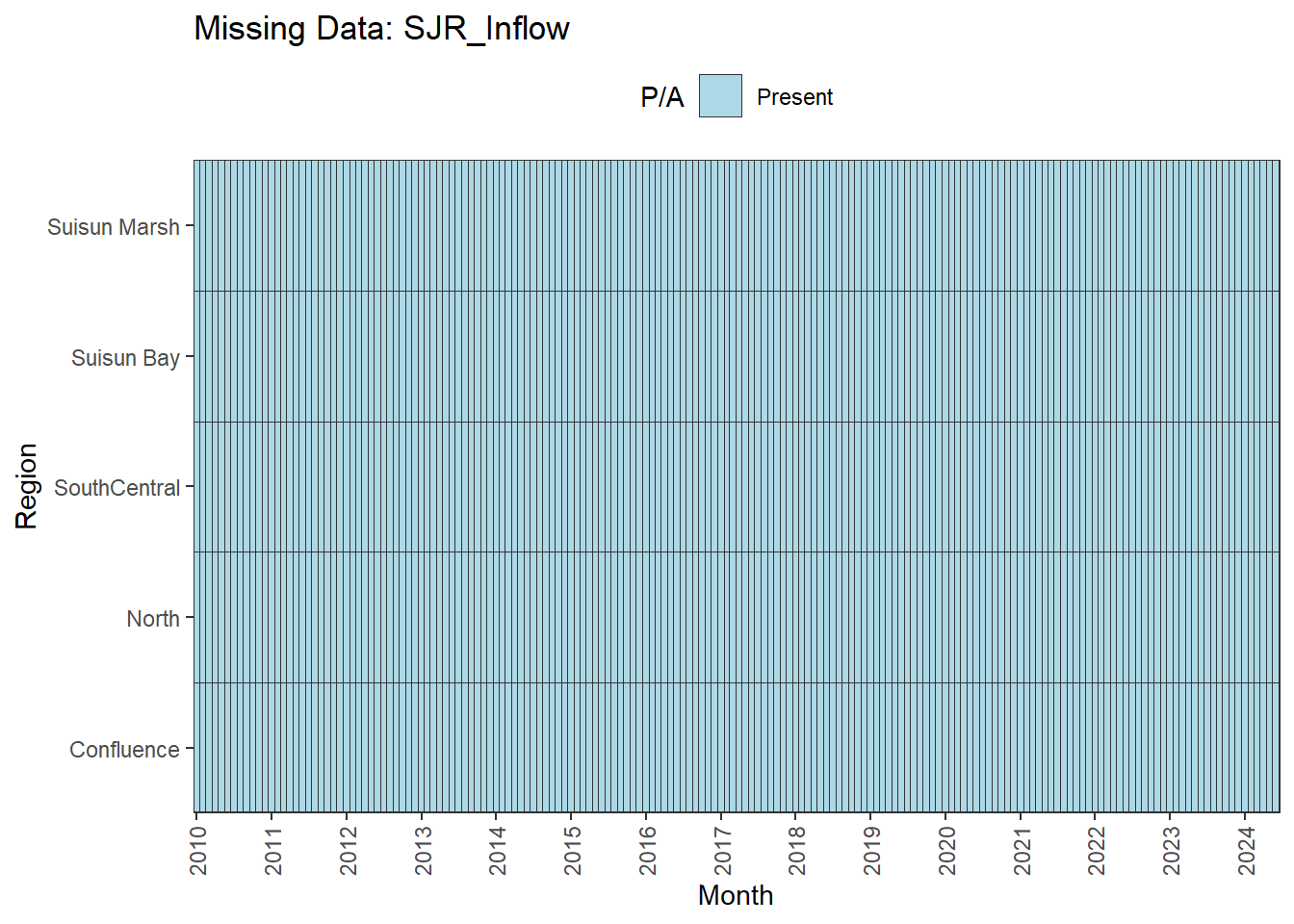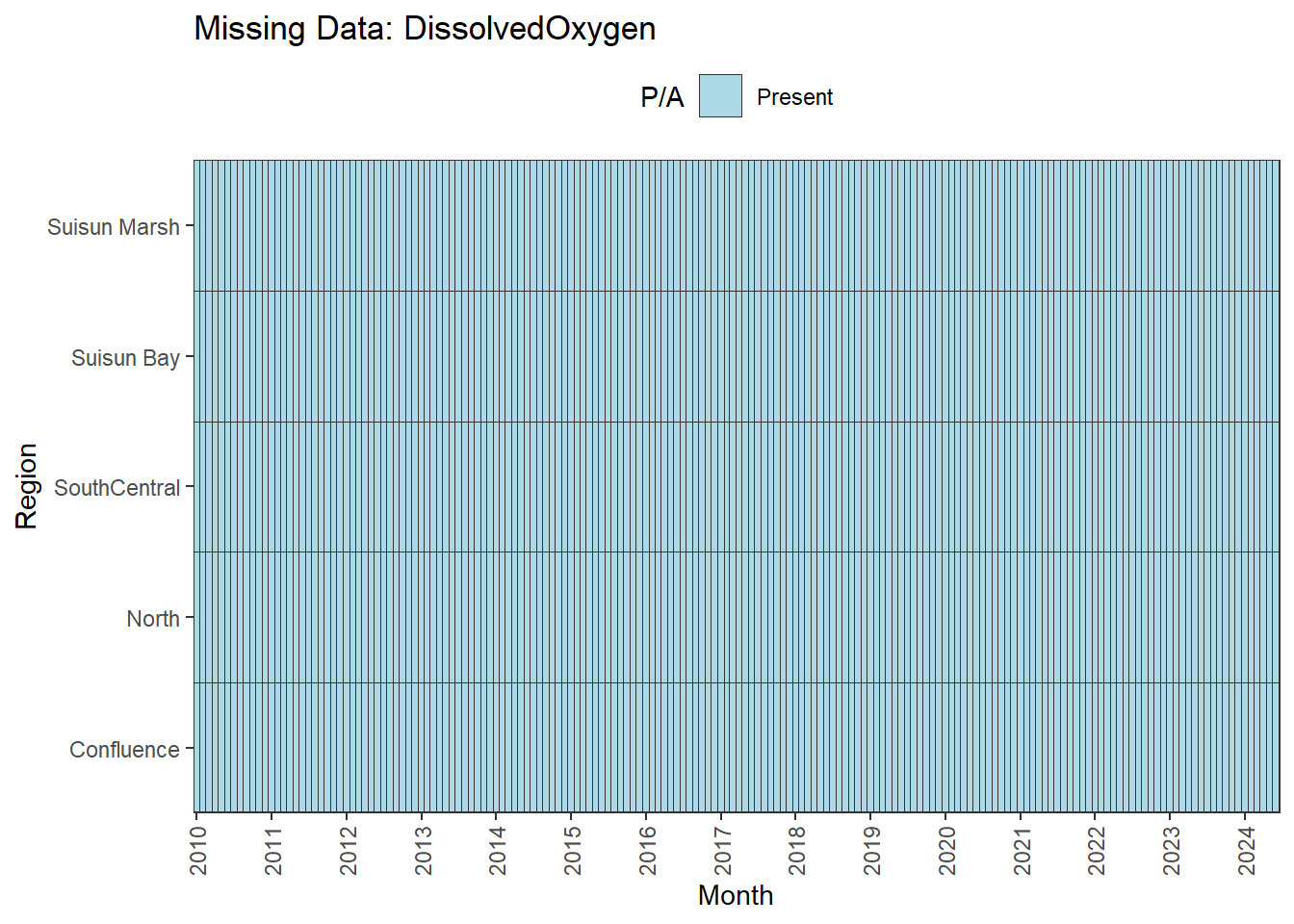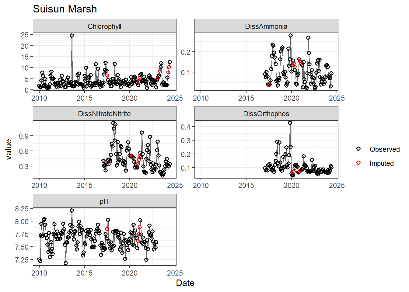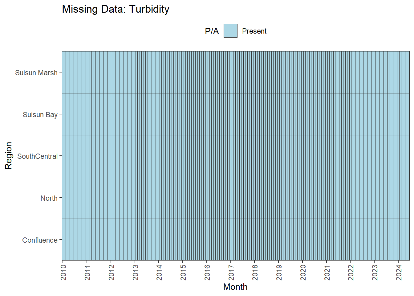**missing data (Suisun Marsh):** DissAmmonia, DissNitrateNitrite, DissOrthophos, DON, TKN, TotPhos