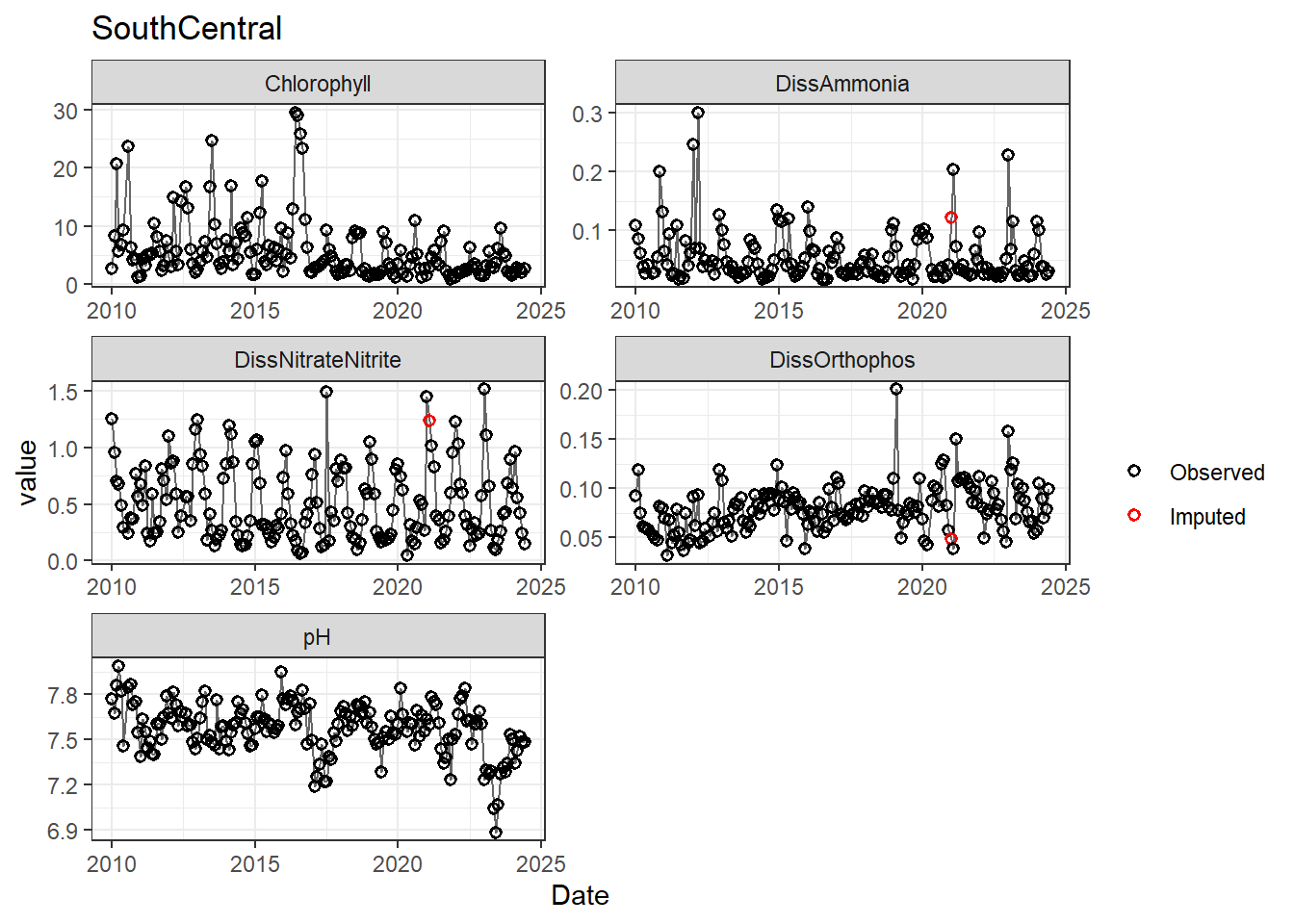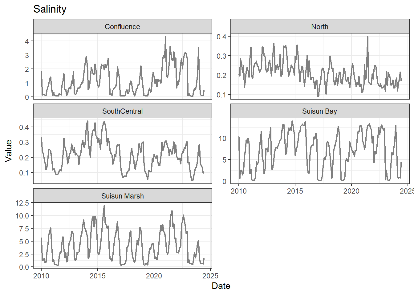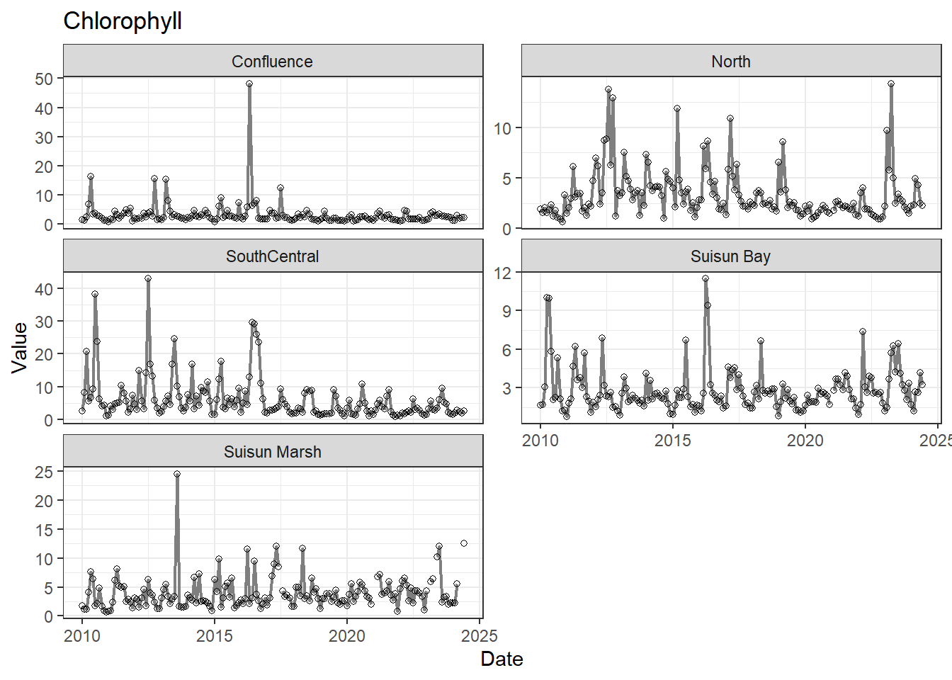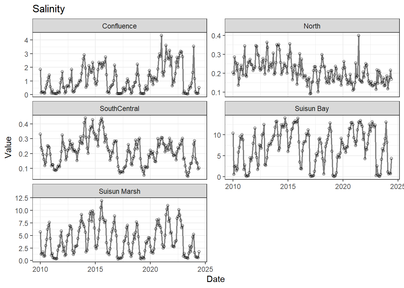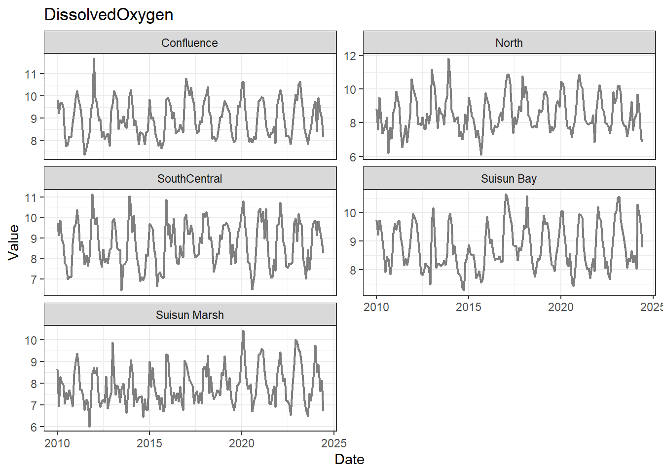 **missing data (Suisun Marsh):** DissAmmonia, DissNitrateNitrite, DissOrthophos, DON, TKN, TotPhos