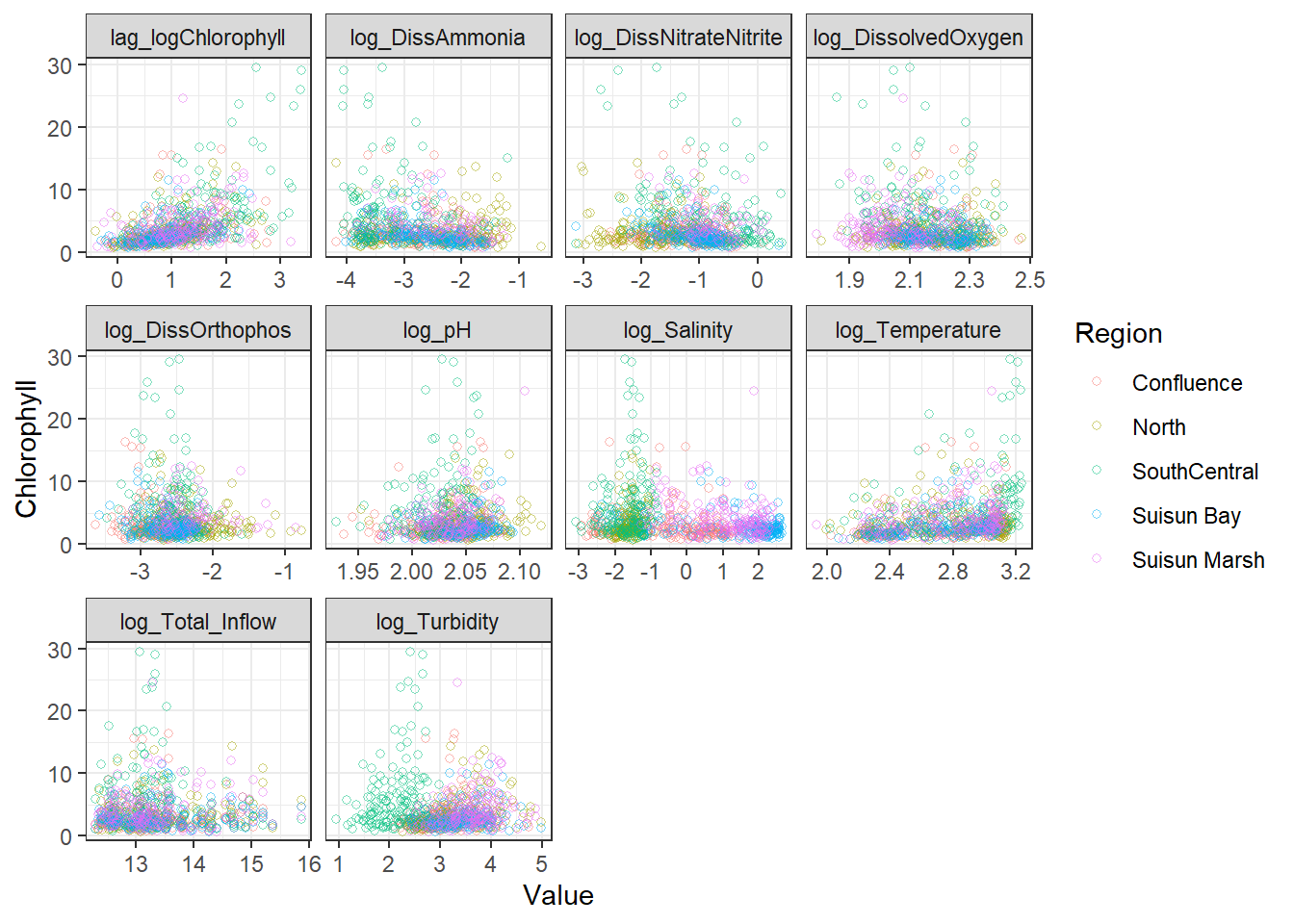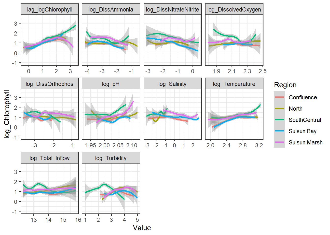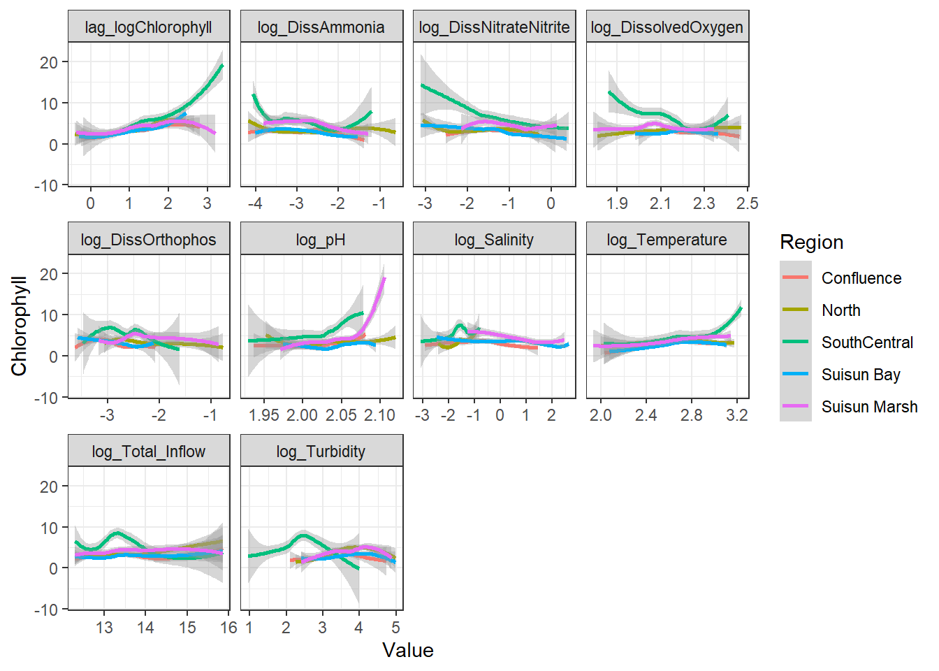 \text{log(Chlorophyll)} \sim \text{log(DissAmmonia)} + \text{...} + \text{RE(Region)}