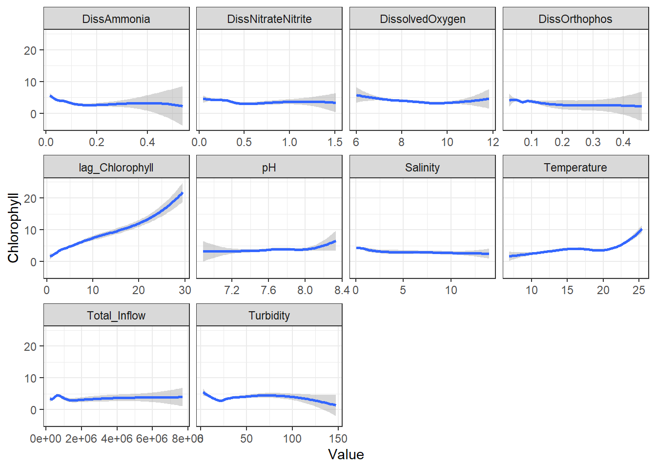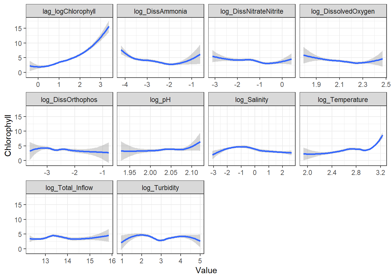 In the previous models, we identified the relationship between Chlorophyll and Temperature as non-linear, so we added polynomial basis functions to our formulas. GAMs essentially do the exact same thing but use splines instead, which are more sophisticated.