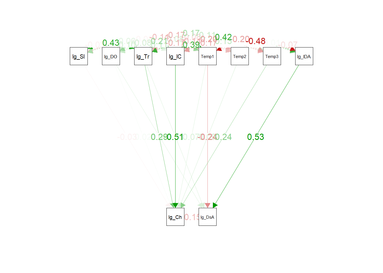 We note that the coefficients are very similar; the main difference is in interpretation. Here, the high RMSEA, especially, points to missing structural paths (as does the somewhat low TLI). By looking at the modification indices, we see that (similar to the d-separation tests from psem) a log_DissAmmonia \~ log_Salinity link is likely missing.