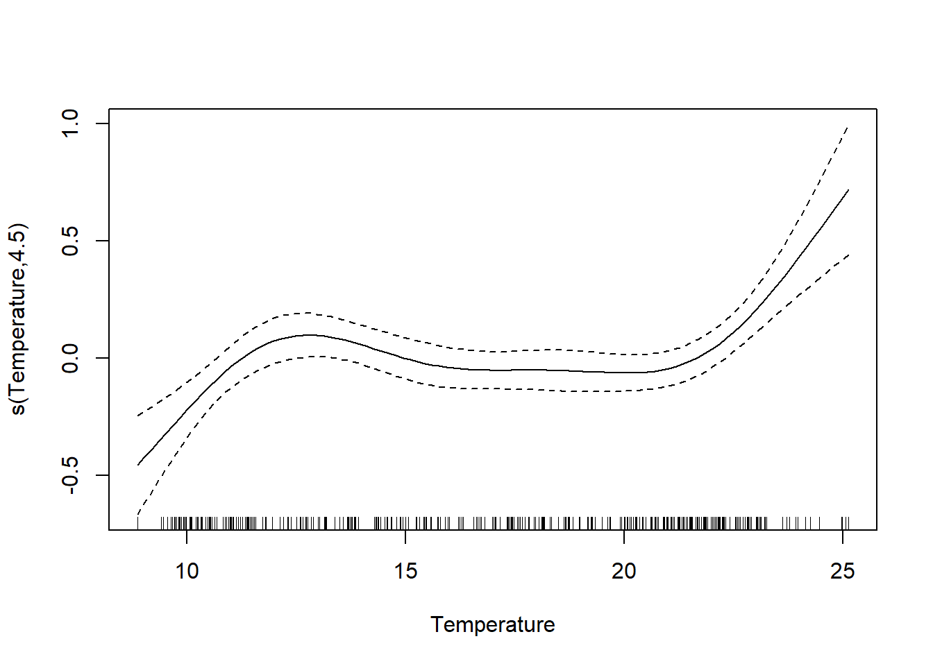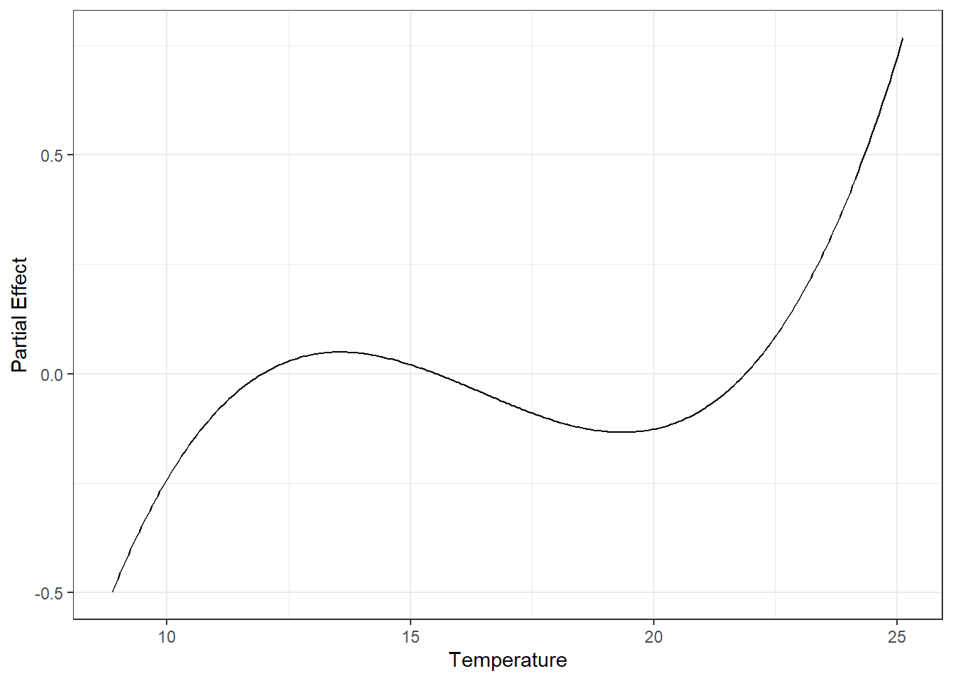 However, the big difference is that Temperature is now included as a smooth function instead of multiple polynomial terms. This changes the shape of its partial effect curve:
