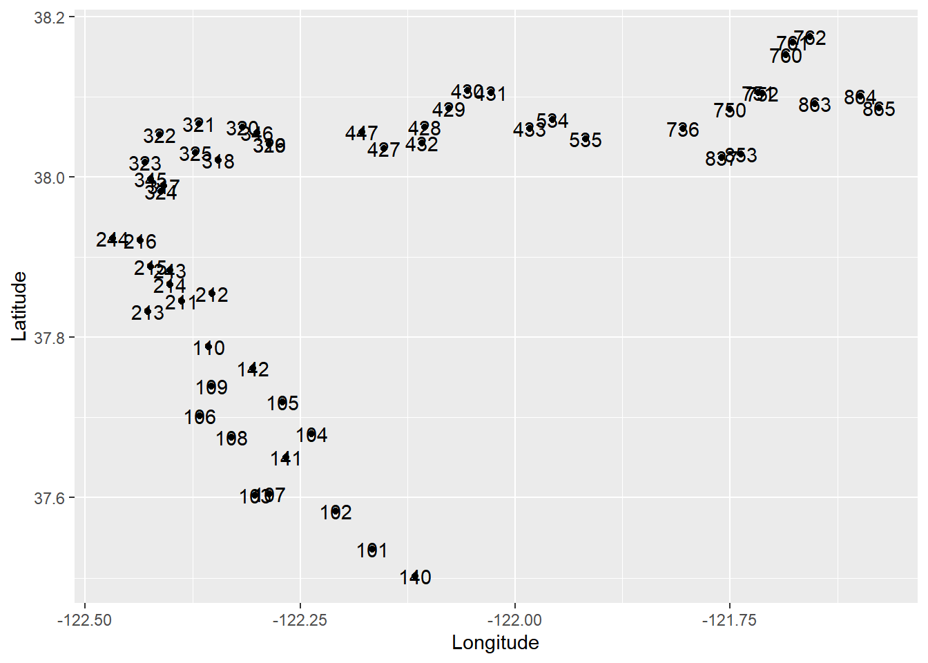 ggplot(baystudy_latlon, aes(x = Longitude, y = Latitude, label = Station)) + geom_point() + geom_text()